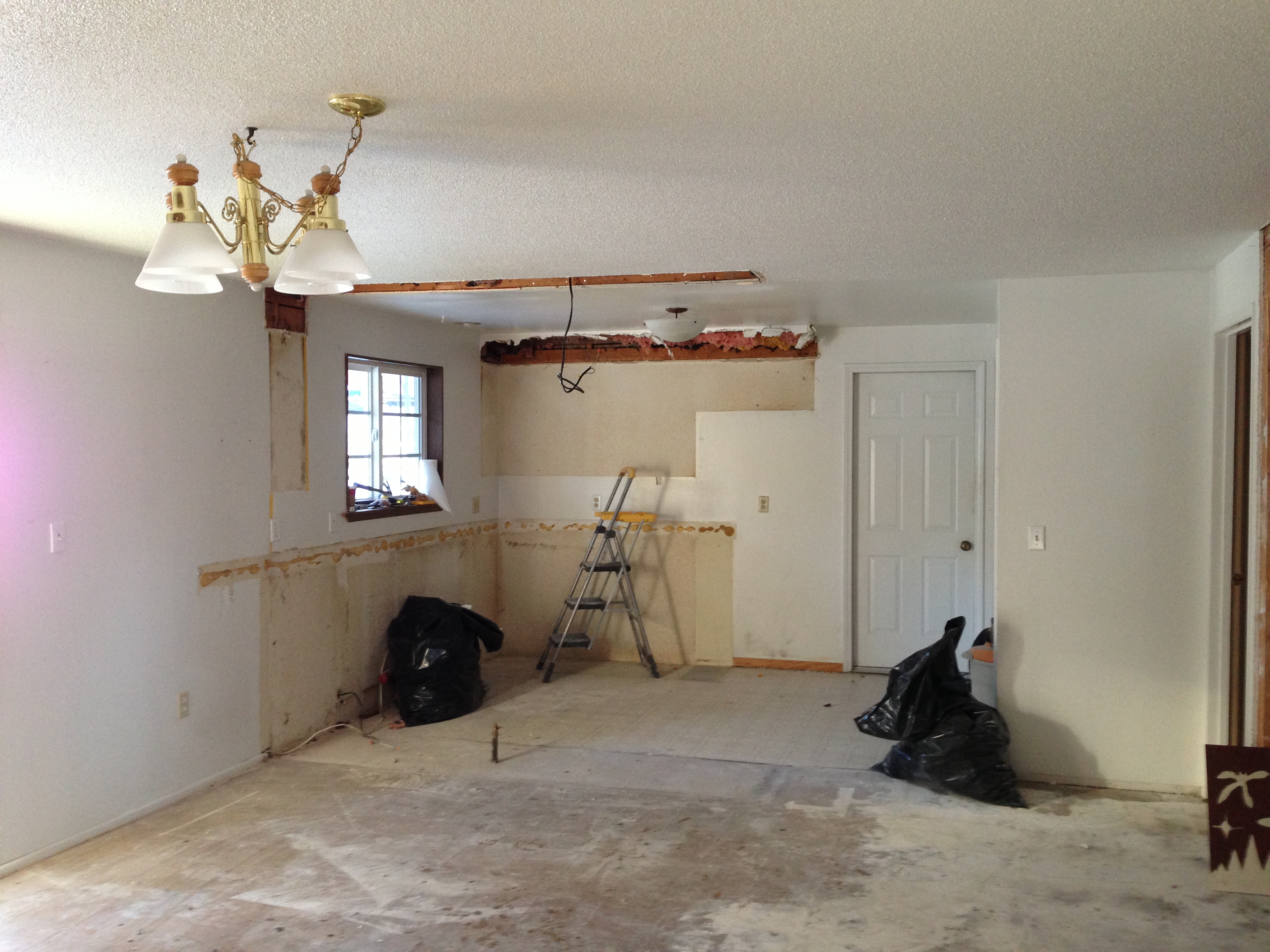 All clear. Rawwrrr, victory! We ripped out the soffits to create a clean ceiling line and maximize the space for open shelving. At this point, I am dying to take down that gorgeous light fixture and send it to its peaceful grave at the rebuilding center, but it’s the only light left in the room. Baby steps.kitchen demo complete