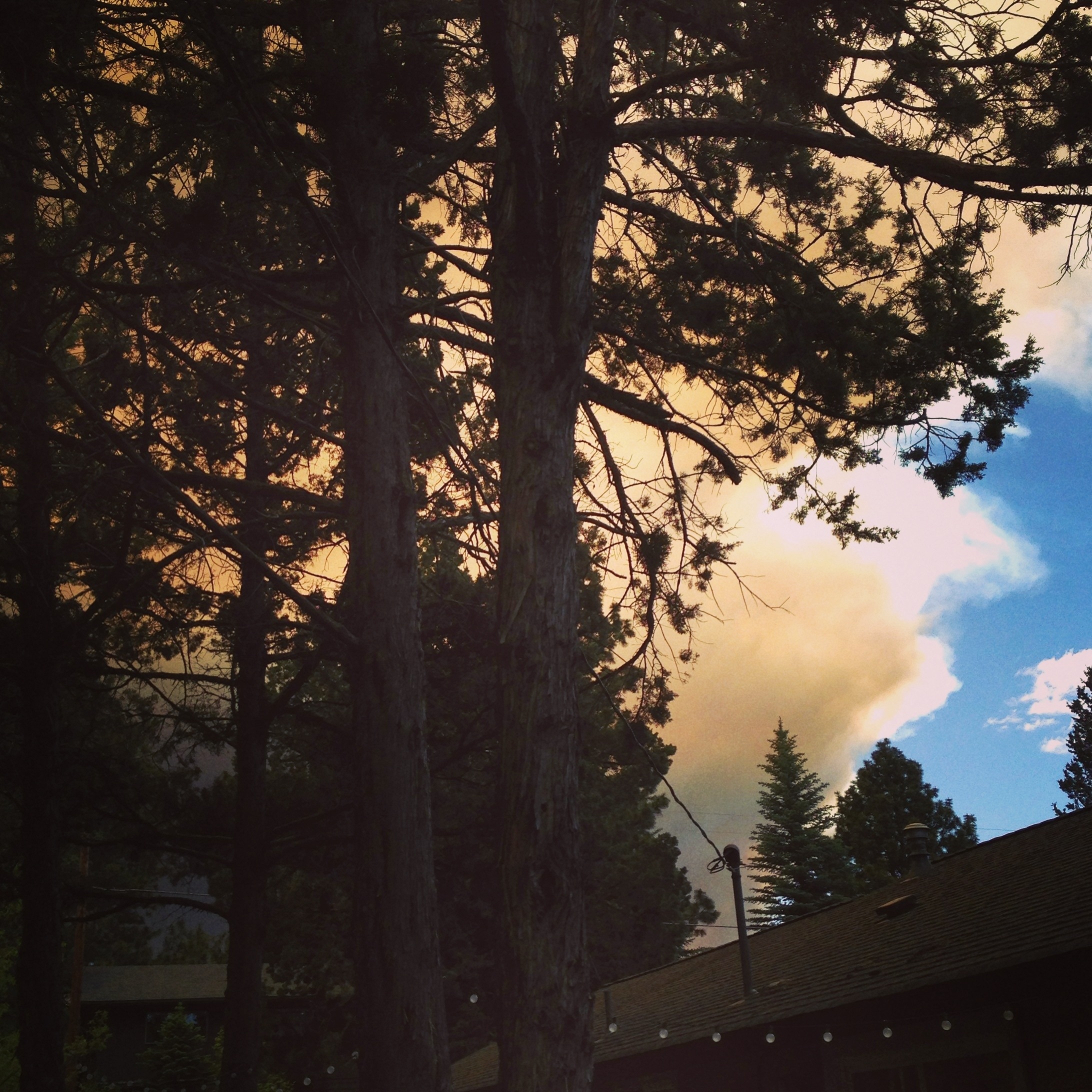 Meantime, a spark flew. An ember got loose. Over 300 acres are burning just a few miles outside of town, and neighborhoods are evacuated. A plume rose in the distance, a dark purple column billowing above our junipers. The sun was a red circle, everything bathed in pinkish orange light. Sunset light at two o’clock in the afternoon.