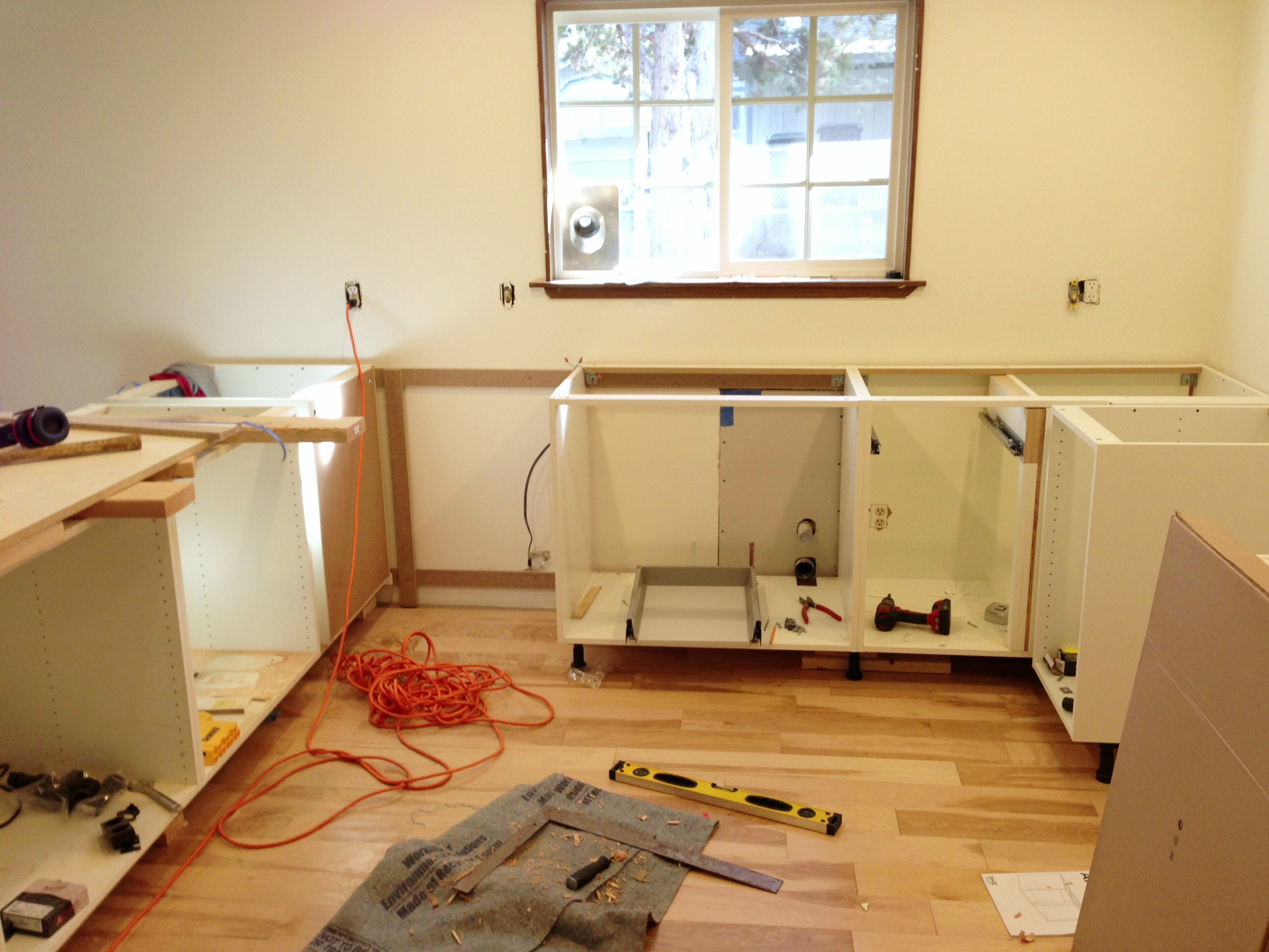 After a few tweaks (just where would we include a recycling/trash center? Are we sure about open shelving?), the spouse printed out the IKDO plan and parts list, flew to Portland, rented a truck, and hauled home our kitchen. He spent about a week, tackling it after hours, getting the lowers fully installed. This included creating his own custom base out of lumber instead of the stock IKEA feet. It also included a modified box for the blind corner.