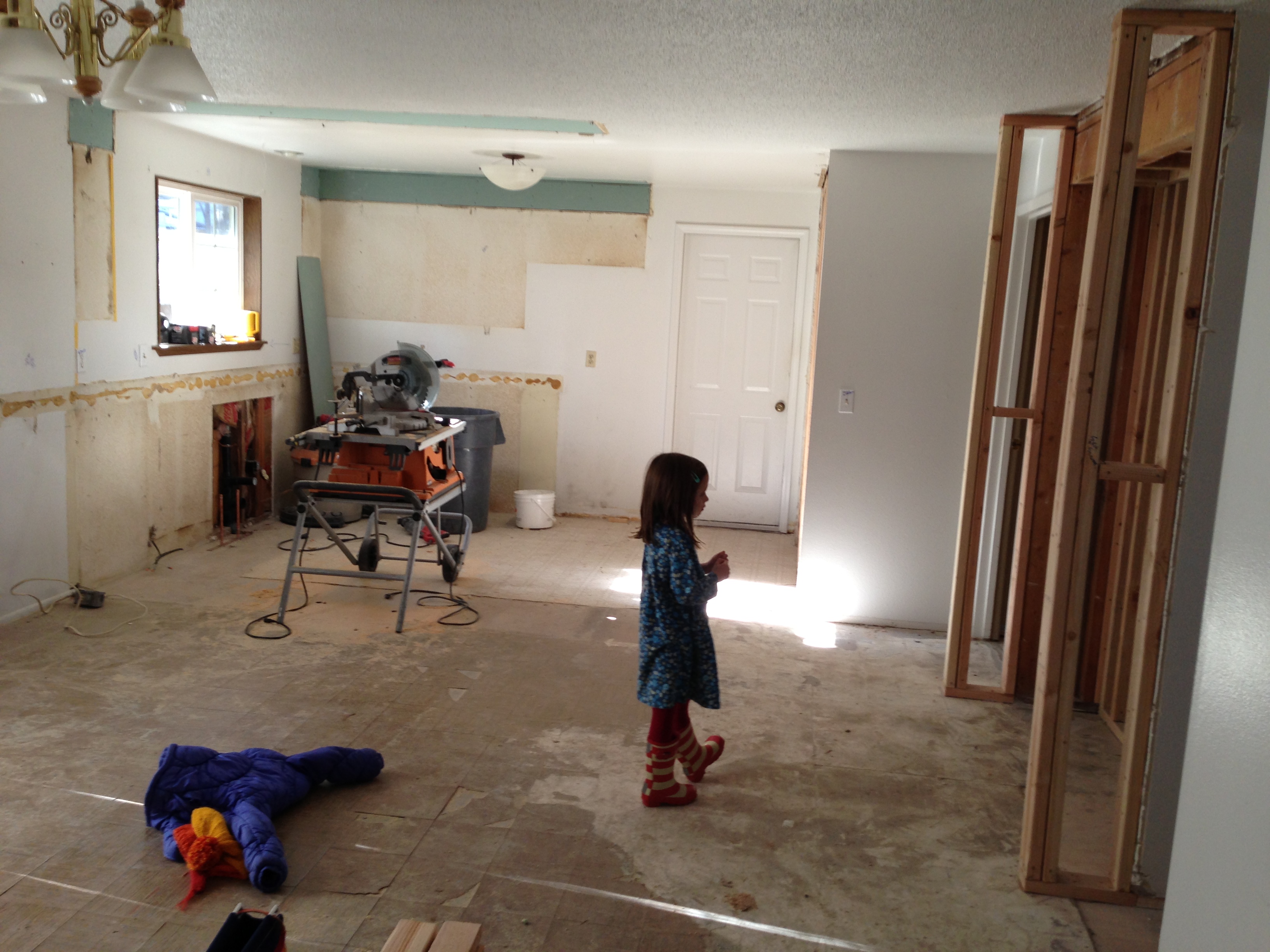 Drywall and ceilings repaired from demo work; framing for kitchen desk at right. The kid, massively skeptical that we could ever possibly live in this place.