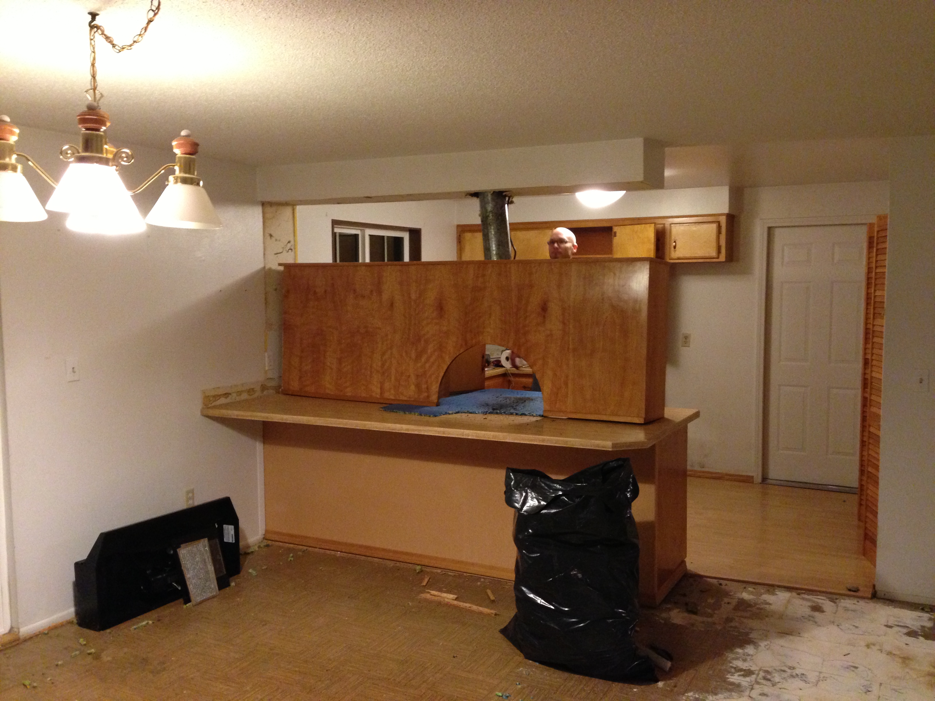 This is the original kitchen. Well, most of the cabinetry is original — the countertops were “upgraded” at some point with a gigantic remnant slab of faux woodgrain laminate. The overhang was ridiculous — almost two feet. And it was supported by the cheapest shelf brackets you can buy. The peninsula face was a cheap, thin piece of fiberboard. The arched peekaboo over the stove was probably carved out with a jigsaw at some point. The short backsplash was peeling away from the wall. This shot was taken right before we started ripping out the filthy carpet.